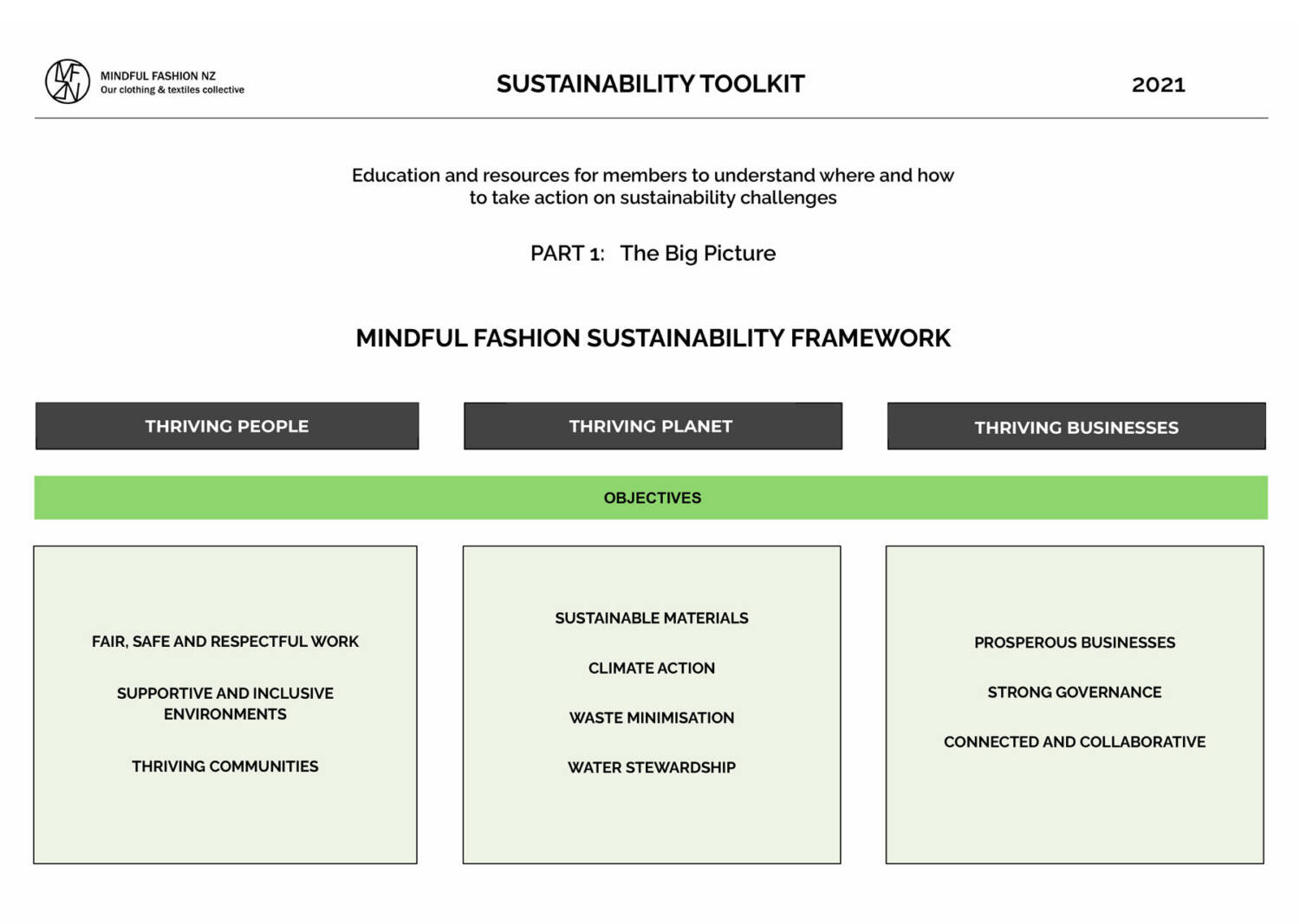The objective of the framework is to create a community of positive change in the New Zealand clothing and textiles industry, where members are supported to set ambition and further their own sustainability goals, in a way that works for their business.